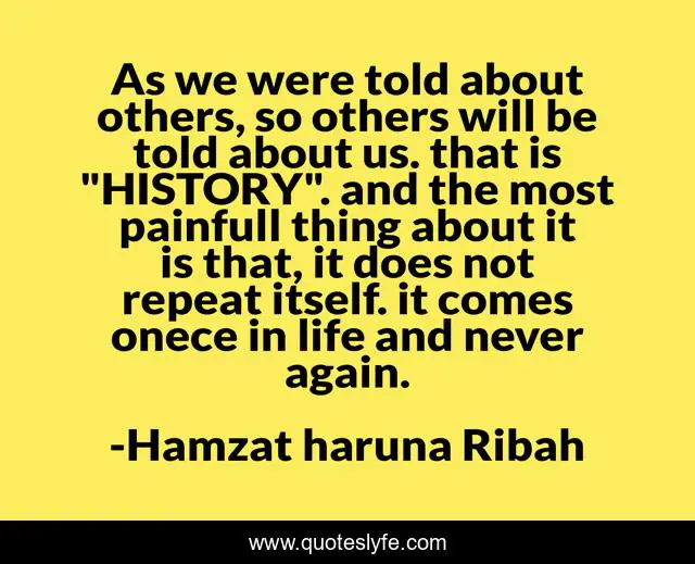 This page presents the quote "As we were told about others, so others will be told about us. that is "HISTORY". and the most painfull thing about it is that, it does not repeat itself. it comes onece in life and never again.". Author of this quote is Hamzat haruna Ribah. This quote is about life, inspration, painfull, thougth, lesson, friends, history,.