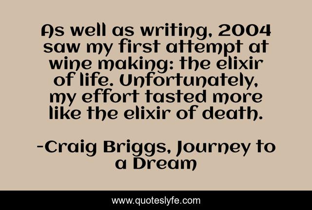 This page presents the quote "As well as writing, 2004 saw my first attempt at wine making: the elixir of life. Unfortunately, my effort tasted more like the elixir of death.". Author of this quote is Craig Briggs, Journey to a Dream. This quote is about autobiography, travel, memoir, spain,.