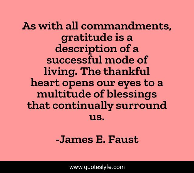 This page presents the quote "As with all commandments, gratitude is a description of a successful mode of living. The thankful heart opens our eyes to a multitude of blessings that continually surround us.". Author of this quote is James E. Faust. This quote is about gratitude, heart, eyes,.