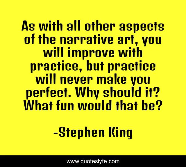 This page presents the quote "As with all other aspects of the narrative art, you will improve with practice, but practice will never make you perfect. Why should it? What fun would that be?". Author of this quote is Stephen King. This quote is about positive, confidence, motivational, optimistic, writing,.
