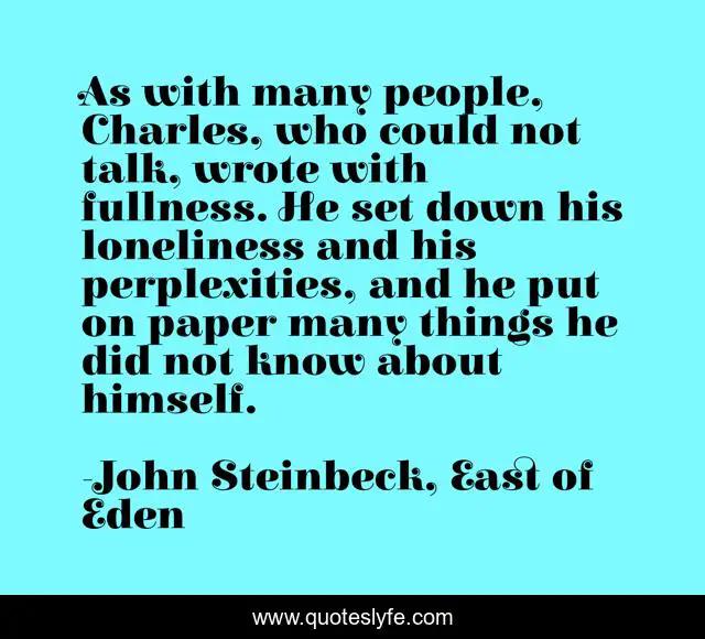 This page presents the quote "As with many people, Charles, who could not talk, wrote with fullness. He set down his loneliness and his perplexities, and he put on paper many things he did not know about himself.". Author of this quote is John Steinbeck, East of Eden. This quote is about authors, writing,.