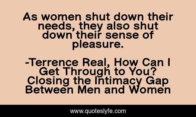 This page presents the quote "As women shut down their needs, they also shut down their sense of pleasure.". Author of this quote is Terrence Real, How Can I Get Through to You? Closing the Intimacy Gap Between Men and Women. .