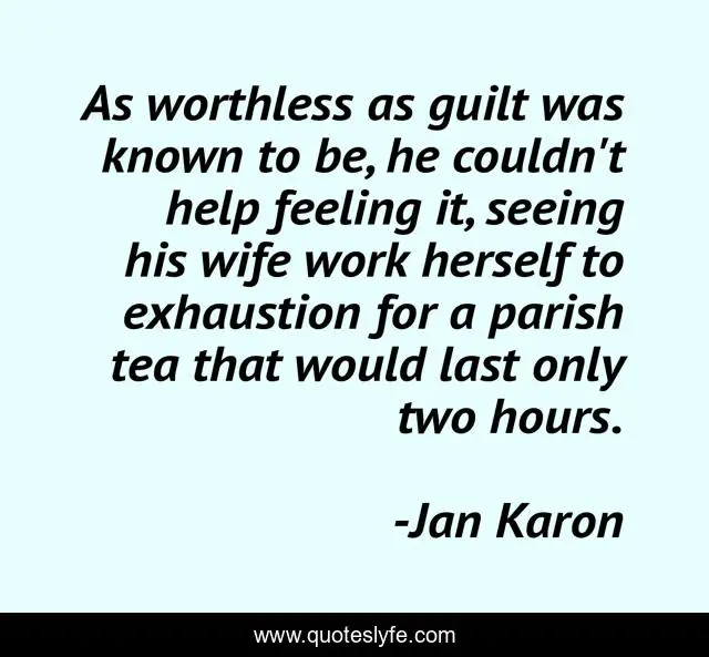 This page presents the quote "As worthless as guilt was known to be, he couldn't help feeling it, seeing his wife work herself to exhaustion for a parish tea that would last only two hours.". Author of this quote is Jan Karon. .