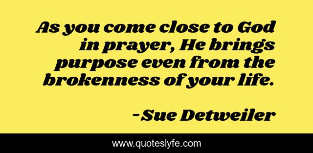 This page presents the quote "As you come close to God in prayer, He brings purpose even from the brokenness of your life.". Author of this quote is Sue Detweiler. This quote is about prayer-life, prayer, women,.