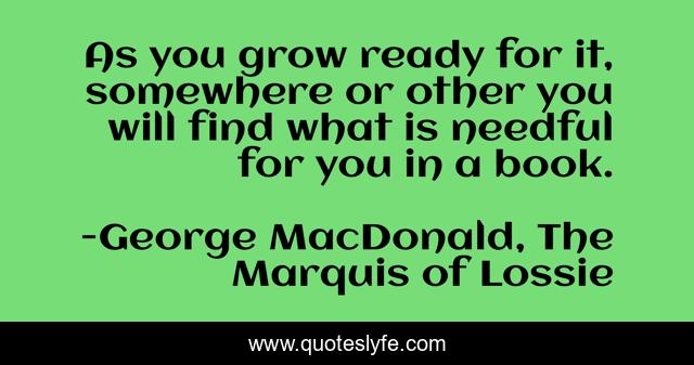 This page presents the quote "As you grow ready for it, somewhere or other you will find what is needful for you in a book.". Author of this quote is George MacDonald, The Marquis of Lossie. This quote is about books, reading, fate,.