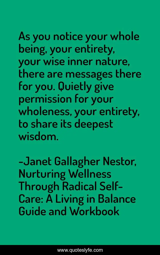 This page presents the quote "As you notice your whole being, your entirety, your wise inner nature, there are messages there for you. Quietly give permission for your wholeness, your entirety, to share its deepest wisdom.". Author of this quote is Janet Gallagher Nestor, Nurturing Wellness Through Radical Self-Care: A Living in Balance Guide and Workbook. This quote is about self-awareness, mindfulness, wellbeing, stress-relief, spirituality, meditation,.