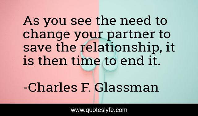 This page presents the quote "As you see the need to change your partner to save the relationship, it is then time to end it.". Author of this quote is Charles F. Glassman. This quote is about change, enthusiasm, inspirational, relationship, personal-growth,.