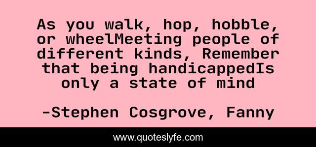 This page presents the quote "As you walk, hop, hobble, or wheelMeeting people of different kinds, Remember that being handicappedIs only a state of mind". Author of this quote is Stephen Cosgrove, Fanny. This quote is about diversity, handicap, inspirational, enthusiasm, lesson, tolerance,.