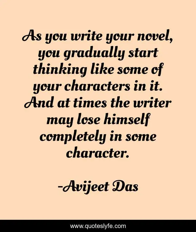 This page presents the quote "As you write your novel, you gradually start thinking like some of your characters in it. And at times the writer may lose himself completely in some character.". Author of this quote is Avijeet Das. This quote is about writing-craft, characters-in-novels, writing-process, writers-on-writing-books, quotes-on-writing, novel-writing, novelist, writers-on-writing, novelist-and-poet,.