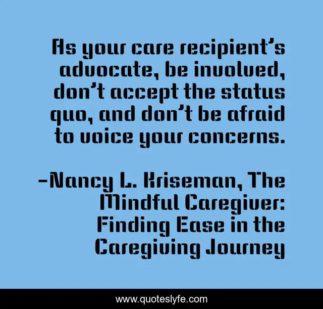 This page presents the quote "As your care recipient’s advocate, be involved, don’t accept the status quo, and don’t be afraid to voice your concerns.". Author of this quote is Nancy L. Kriseman, The Mindful Caregiver: Finding Ease in the Caregiving Journey. This quote is about caregiver, mindfulness, elder-care, caregiver-motivational, alzheimers-elder-care, mindfulness-practice, caregiving, alzheimer-s, alzheimer-s-caregiver,.