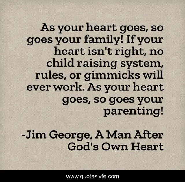 This page presents the quote "As your heart goes, so goes your family! If your heart isn't right, no child raising system, rules, or gimmicks will ever work. As your heart goes, so goes your parenting!". Author of this quote is Jim George, A Man After God's Own Heart. This quote is about heart, right, christian, parent, family, rules, god, men, system,.