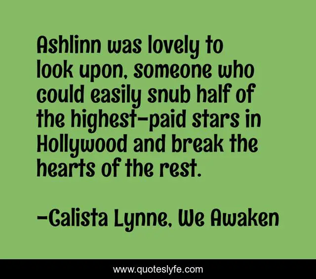 This page presents the quote "Ashlinn was lovely to look upon, someone who could easily snub half of the highest-paid stars in Hollywood and break the hearts of the rest.". Author of this quote is Calista Lynne, We Awaken. This quote is about couple, young-adult-fiction, love, romantic, affection,.