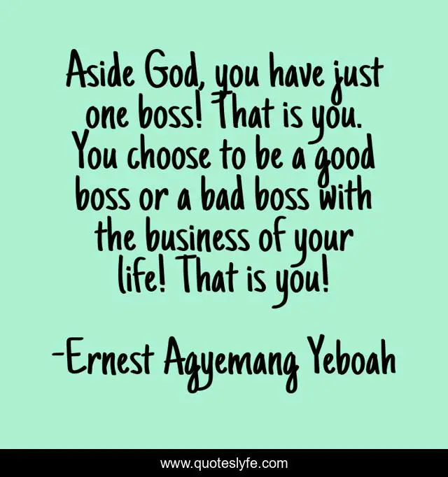 This page presents the quote "Aside God, you have just one boss! That is you. You choose to be a good boss or a bad boss with the business of your life! That is you!". Author of this quote is Ernest Agyemang Yeboah. This quote is about life-choices, life, a-profitable-life, choices,.