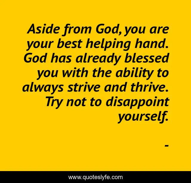 This page presents the quote "Aside from God, you are your best helping hand. God has already blessed you with the ability to always strive and thrive. Try not to disappoint yourself.". Author of this quote is . This quote is about edmond-mbiaka, strive-and-thrive, don-t-disappoint-yourself, ability, helping-hand,.