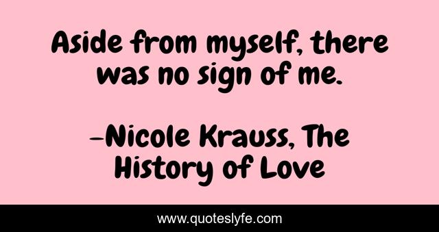 This page presents the quote "Aside from myself, there was no sign of me.". Author of this quote is Nicole Krauss, The History of Love. This quote is about alone, existence, self, loss,.