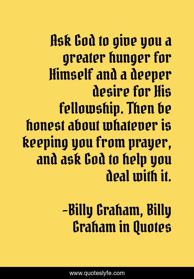 This page presents the quote "Ask God to give you a greater hunger for Himself and a deeper desire for His fellowship. Then be honest about whatever is keeping you from prayer, and ask God to help you deal with it.". Author of this quote is Billy Graham, Billy Graham in Quotes. This quote is about billy-graham, prayer,.