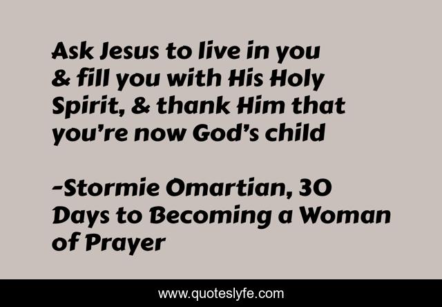 This page presents the quote "Ask Jesus to live in you & fill you with His Holy Spirit, & thank Him that you’re now God’s child". Author of this quote is Stormie Omartian, 30 Days to Becoming a Woman of Prayer. This quote is about life, woman, god, thankful, prayer, holy-spirit,.