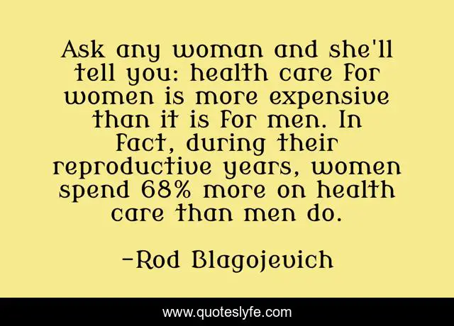 This page presents the quote "Ask any woman and she'll tell you: health care for women is more expensive than it is for men. In fact, during their reproductive years, women spend 68% more on health care than men do.". Author of this quote is Rod Blagojevich. This quote is about woman, health, men,.