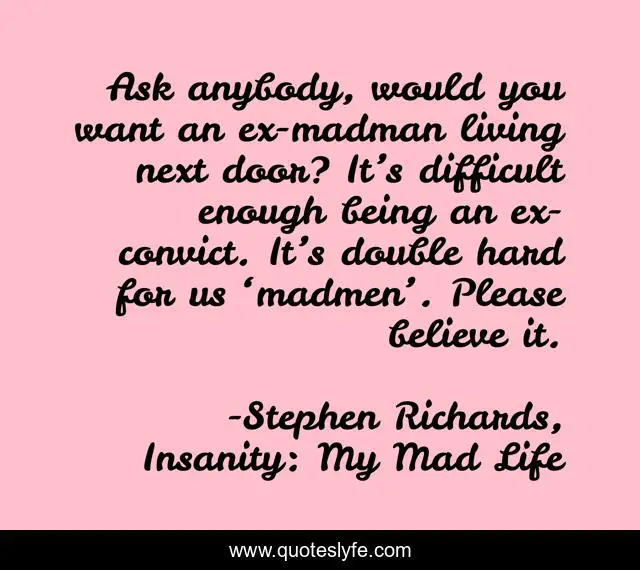 This page presents the quote "Ask anybody, would you want an ex-madman living next door? It’s difficult enough being an ex-convict. It’s double hard for us ‘madmen’. Please believe it.". Author of this quote is Stephen Richards, Insanity: My Mad Life. This quote is about prisoner, charles-bronson, madness, insanity,.