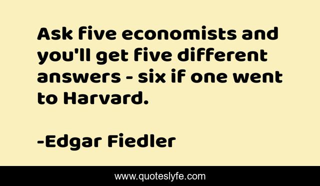 This page presents the quote "Ask five economists and you'll get five different answers - six if one went to Harvard.". Author of this quote is Edgar Fiedler. This quote is about funny, harvard, comedy, answers, economics,.