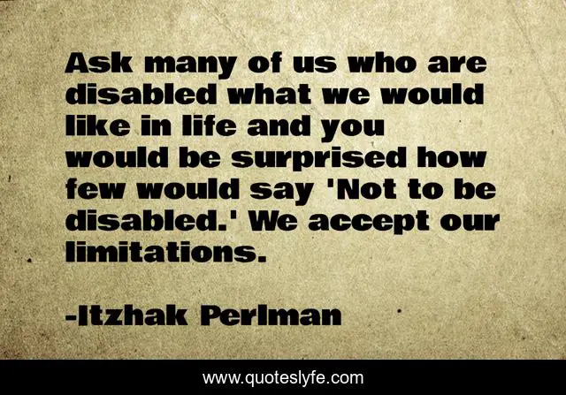 This page presents the quote "Ask many of us who are disabled what we would like in life and you would be surprised how few would say 'Not to be disabled.' We accept our limitations.". Author of this quote is Itzhak Perlman. This quote is about medicine, sickness,.