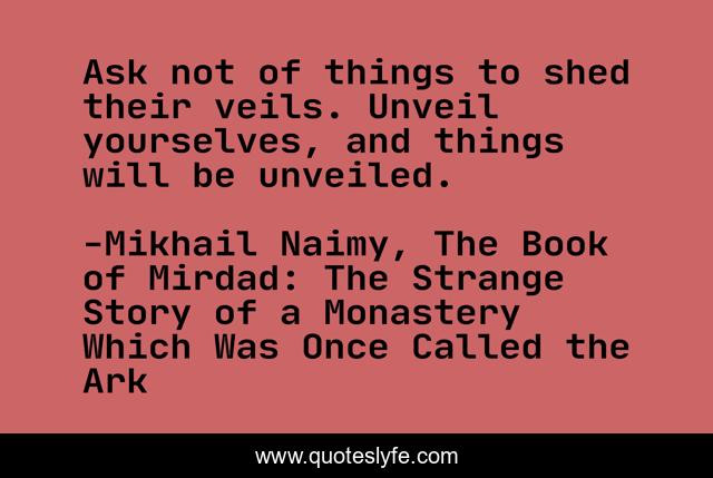This page presents the quote "Ask not of things to shed their veils. Unveil yourselves, and things will be unveiled.". Author of this quote is Mikhail Naimy, The Book of Mirdad: The Strange Story of a Monastery Which Was Once Called the Ark. This quote is about self-knowledge, wisdom,.