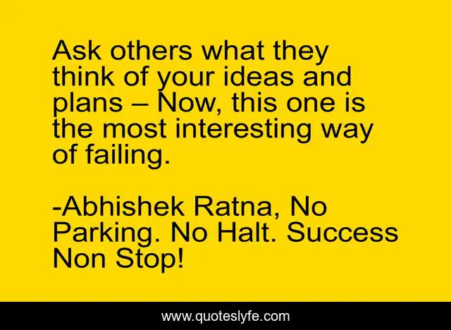 This page presents the quote "Ask others what they think of your ideas and plans – Now, this one is the most interesting way of failing.". Author of this quote is Abhishek Ratna, No Parking. No Halt. Success Non Stop!. This quote is about failure-and-attitude, success, success-in-life, failure, success-strategies, success-in-business, failure-and-success, successful-living,.