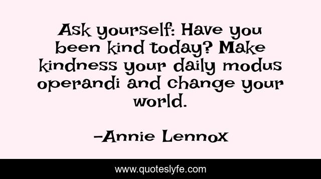 This page presents the quote "Ask yourself: Have you been kind today? Make kindness your daily modus operandi and change your world.". Author of this quote is Annie Lennox. .