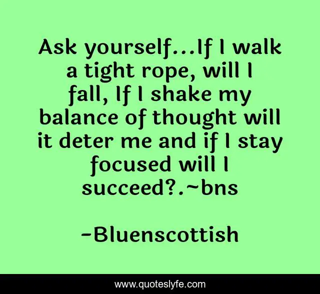 This page presents the quote "Ask yourself...If I walk a tight rope, will I fall, If I shake my balance of thought will it deter me and if I stay focused will I succeed?.~bns". Author of this quote is Bluenscottish. This quote is about leadership, bluenscottish, focus, success,.