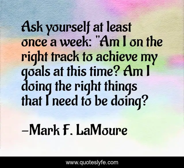 This page presents the quote "Ask yourself at least once a week: "Am I on the right track to achieve my goals at this time? Am I doing the right things that I need to be doing?". Author of this quote is Mark F. LaMoure. This quote is about confidence, success, positive, excellent-people, excellence, self-improvement, inspirational, excellent, determination,.