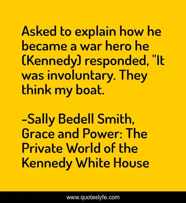 This page presents the quote "Asked to explain how he became a war hero he (Kennedy) responded, "It was involuntary. They think my boat.". Author of this quote is Sally Bedell Smith, Grace and Power: The Private World of the Kennedy White House. This quote is about circumstances, courage, adversity, herorism,.