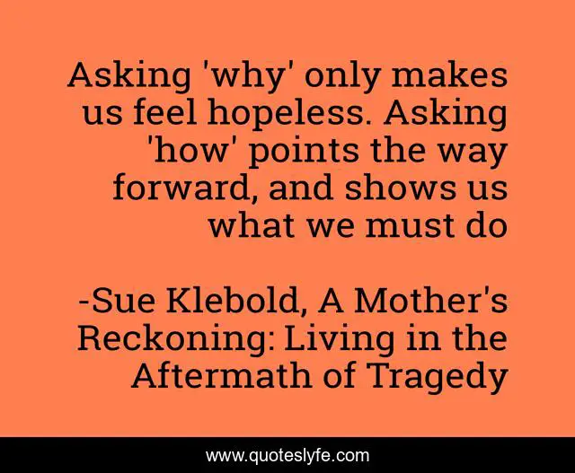 "Sue Klebold, A Mother's Reckoning: Living in the Aftermath of Tragedy Quotes." Quoteslyfe.com, 2025. Mon. 08 Dec. 2025. <https://www.quoteslyfe.com/quote/Asking-why-only-makes-us-feel-hopeless-113808>.