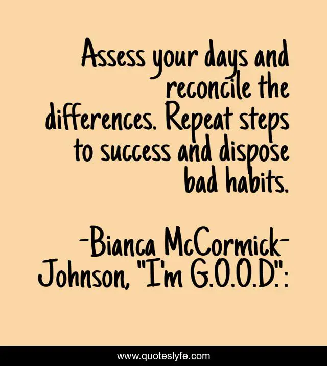 This page presents the quote "Assess your days and reconcile the differences. Repeat steps to success and dispose bad habits.". Author of this quote is Bianca McCormick-Johnson, "I'm G.O.O.D.":. This quote is about motivation, positive, motivational, confidence, optimistic, inspirational, enthusiasm, inspiration,.