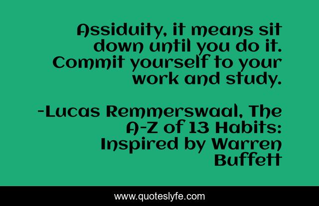 This page presents the quote "Assiduity, it means sit down until you do it. Commit yourself to your work and study.". Author of this quote is Lucas Remmerswaal, The A-Z of 13 Habits: Inspired by Warren Buffett. This quote is about study, work, habits, assiduity,.