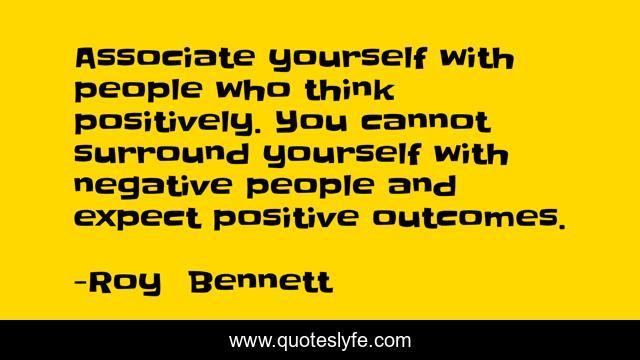 This page presents the quote "Associate yourself with people who think positively. You cannot surround yourself with negative people and expect positive outcomes.". Author of this quote is Roy Bennett. This quote is about life, being-positive, positive-affirmation, confidence, optimism, positive-life, optimistic, positive, positive-thinking,.