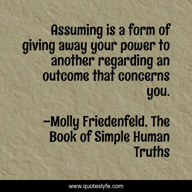 This page presents the quote "Assuming is a form of giving away your power to another regarding an outcome that concerns you.". Author of this quote is Molly Friedenfeld, The Book of Simple Human Truths. This quote is about love, power, joy, peace, wisdom, honor, truth, assuming, integrity,.