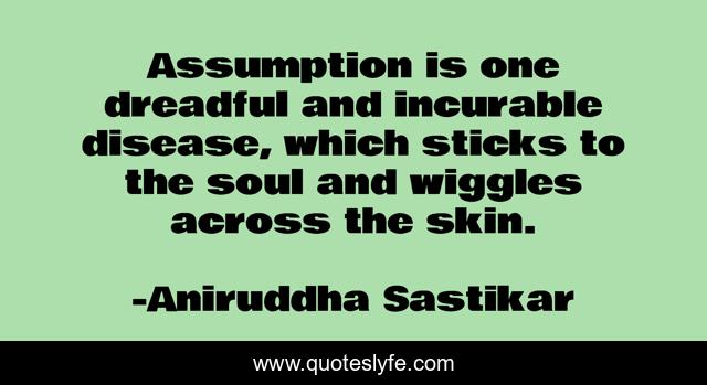 This page presents the quote "Assumption is one dreadful and incurable disease, which sticks to the soul and wiggles across the skin.". Author of this quote is Aniruddha Sastikar. This quote is about guess, belief, assuming, soul, fancy, disease, bane, stuck, assumption,.