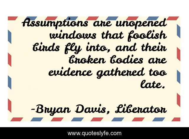 This page presents the quote "Assumptions are unopened windows that foolish birds fly into, and their broken bodies are evidence gathered too late.". Author of this quote is Bryan Davis, Liberator. This quote is about funny, harsh, irony, assumptions, comedy, blunt, comical,.