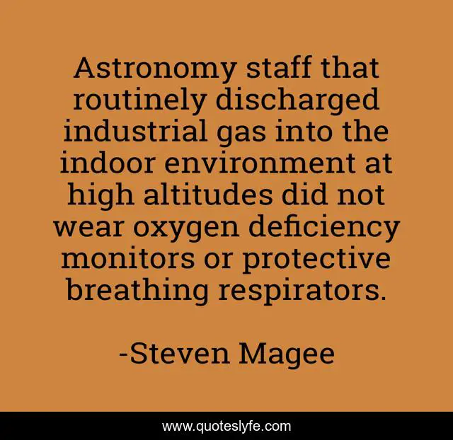 This page presents the quote "Astronomy staff that routinely discharged industrial gas into the indoor environment at high altitudes did not wear oxygen deficiency monitors or protective breathing respirators.". Author of this quote is Steven Magee. This quote is about industrial, routinely, astronomical, indoor, high, deficiency, astronomer, breathing, astrobiology,.