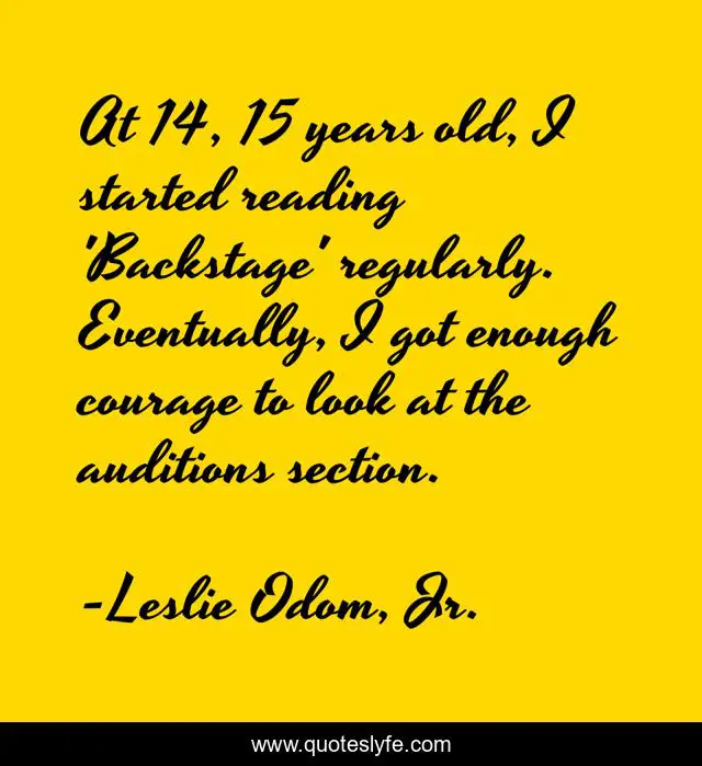 This page presents the quote "At 14, 15 years old, I started reading 'Backstage' regularly. Eventually, I got enough courage to look at the auditions section.". Author of this quote is Leslie Odom, Jr.. This quote is about reading, look, years,.