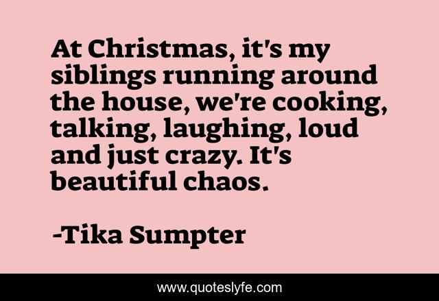 This page presents the quote "At Christmas, it's my siblings running around the house, we're cooking, talking, laughing, loud and just crazy. It's beautiful chaos.". Author of this quote is Tika Sumpter. This quote is about beautiful, crazy, cooking,.