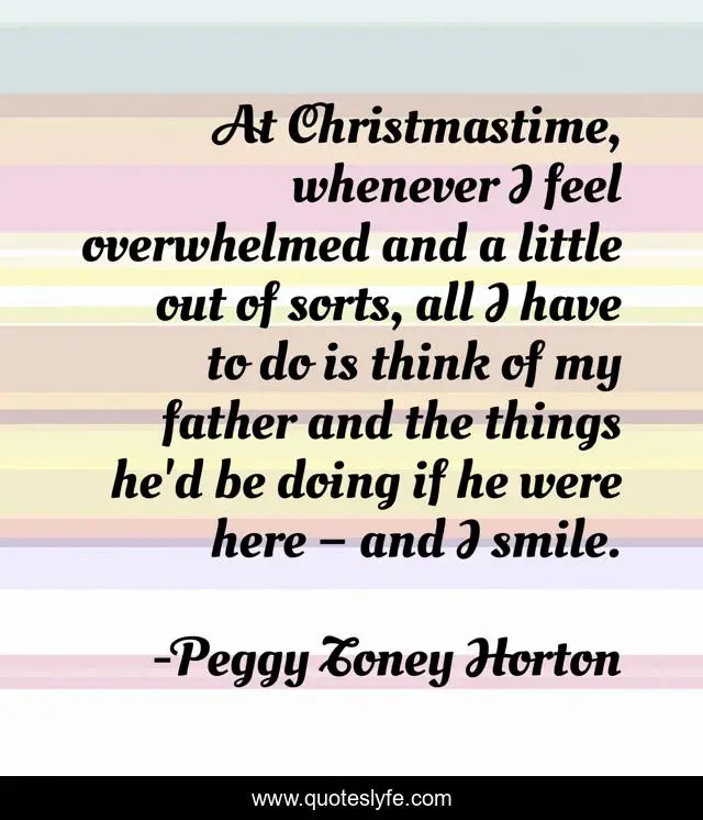 This page presents the quote "At Christmastime, whenever I feel overwhelmed and a little out of sorts, all I have to do is think of my father and the things he'd be doing if he were here – and I smile.". Author of this quote is Peggy Toney Horton. This quote is about smile, father, christmas, happiness, overwhelmed,.