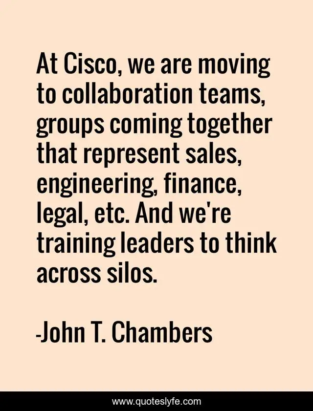 This page presents the quote "At Cisco, we are moving to collaboration teams, groups coming together that represent sales, engineering, finance, legal, etc. And we're training leaders to think across silos.". Author of this quote is John T. Chambers. This quote is about training, together,.