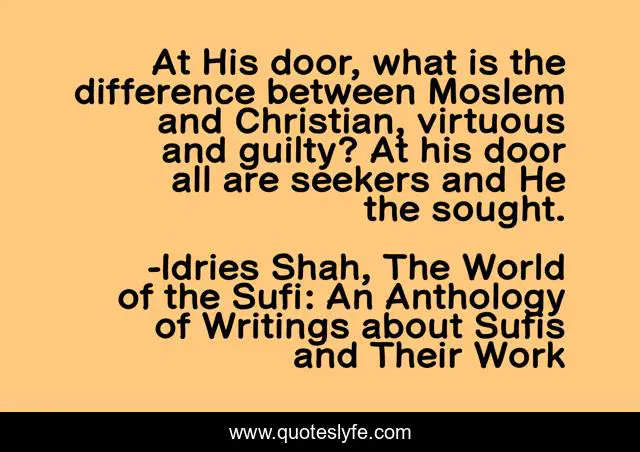 This page presents the quote "At His door, what is the difference between Moslem and Christian, virtuous and guilty? At his door all are seekers and He the sought.". Author of this quote is Idries Shah, The World of the Sufi: An Anthology of Writings about Sufis and Their Work. This quote is about god, religion, sufis, hakim-sanai, sufism,.