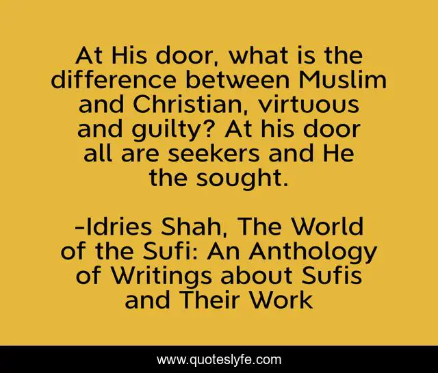 This page presents the quote "At His door, what is the difference between Muslim and Christian, virtuous and guilty? At his door all are seekers and He the sought.". Author of this quote is Idries Shah, The World of the Sufi: An Anthology of Writings about Sufis and Their Work. This quote is about sufism, sufi-wisdom, sufis, hakim-sanai, the-walled-garden-of-truth,.