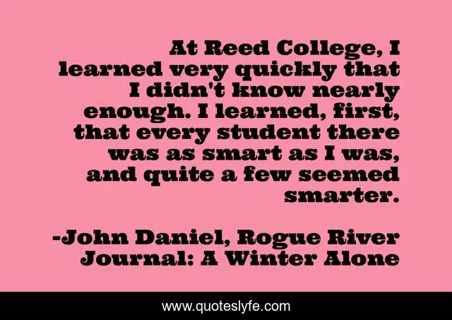 This page presents the quote "At Reed College, I learned very quickly that I didn't know nearly enough. I learned, first, that every student there was as smart as I was, and quite a few seemed smarter.". Author of this quote is John Daniel, Rogue River Journal: A Winter Alone. .