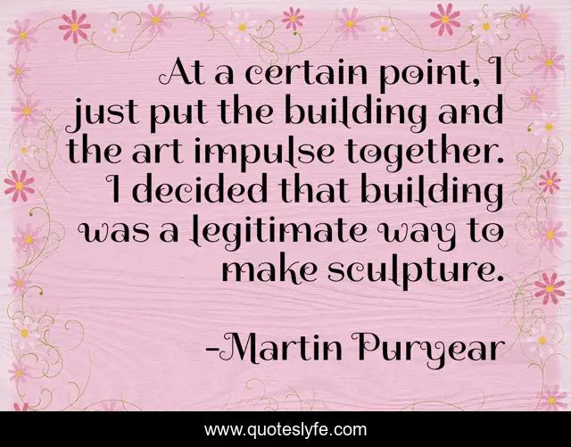 This page presents the quote "At a certain point, I just put the building and the art impulse together. I decided that building was a legitimate way to make sculpture.". Author of this quote is Martin Puryear. This quote is about building, art, together,.