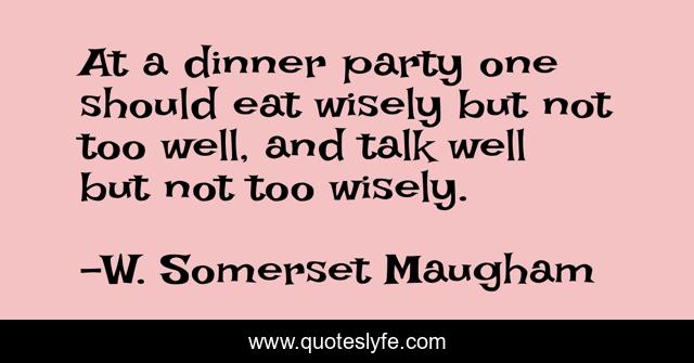 This page presents the quote "At a dinner party one should eat wisely but not too well, and talk well but not too wisely.". Author of this quote is W. Somerset Maugham. This quote is about party, dinner, talk,.