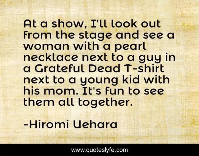 This page presents the quote "At a show, I'll look out from the stage and see a woman with a pearl necklace next to a guy in a Grateful Dead T-shirt next to a young kid with his mom. It's fun to see them all together.". Author of this quote is Hiromi Uehara. This quote is about woman, together, grateful,.