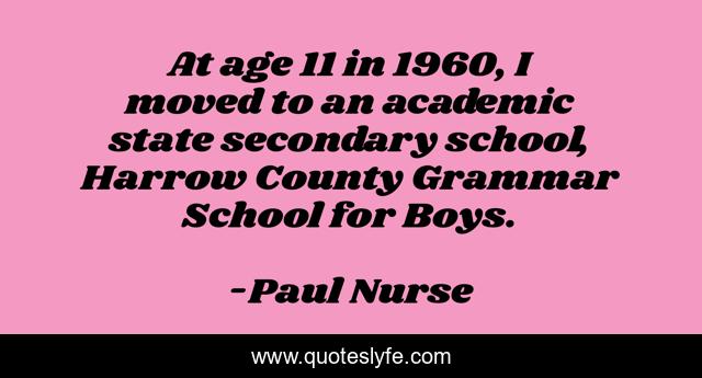 This page presents the quote "At age 11 in 1960, I moved to an academic state secondary school, Harrow County Grammar School for Boys.". Author of this quote is Paul Nurse. This quote is about academic, school, grammar,.
